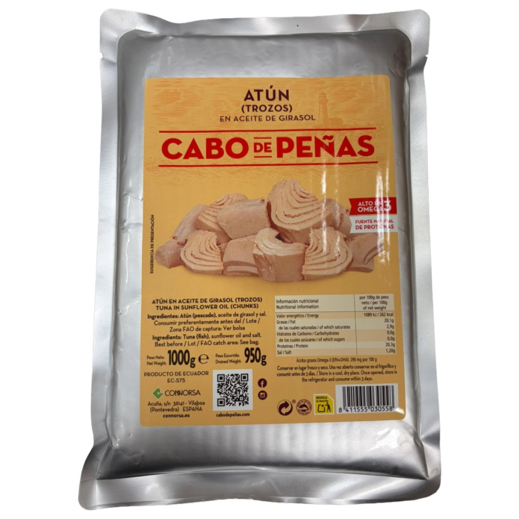 A tonhal darabok olajban a tengeri halkonzervek egyik legnépszerűbb formáját képviselik. A gondosan feldolgozott tonhal napraforgóolajban kerül tartósításra, amely megőrzi a hal természetes ízét és szaftos állagát. A tonhal növényi olajban tartósított változata különösen praktikus, mert a hal húsa könnyen adagolható és számos ételhez felhasználható. Ez a HORECA kiszerelésű termék Ecuadorból származó, kiváló minőségű tonhalból készül, amelyet napraforgóolajban tartósítanak, így a hal húsa szaftos és ízletes marad. Az ecuadori tonhal a Csendes-óceánbólszármazik, ahol Ecuador a világ egyik legfontosabb tonhalhalászati központja. A part menti vizek gazdag halállománya és a gondos előkészítési folyamat lehetővé teszi, hogy a kifogott tonhal rövid időn belül feldolgozásra kerüljön, így megőrizze természetes ízét és tökéletes állagát. Az ecuadori tonhalat világszerte megbízható, jó minőségű alapanyagként tartják számon. A termék prémium összetételű: a zacskó tartalmának 70%-át tonhal törzs, 30%-át tonhal darabok teszik ki. Ez az összetétel kiegyensúlyozott állagot biztosít, amely egyszerre tartalmaz nagyobb, tömörebb húsrészeket és kisebb, könnyen felhasználható darabokat. A tonhal napraforgóolajban így ideális alapanyag különféle ételekhez elkészítéséhez, hiszen a hús jól szétválasztható és könnyen feldolgozható. A HORECA termékeket elsősorban éttermek, szállodák, büfék, catering cégek és közétkeztetés számára gyártják. A nagy, 1000 g-os kiszerelés – 950 g lecsepegtetett tömeggel – különösen praktikus vendéglátóhelyek és szállodák számára. A hosszú, akár 4 éves szavatossági idő és az egyszerű tárolás szintén hozzájárul a termék kényelmes felhasználásához.